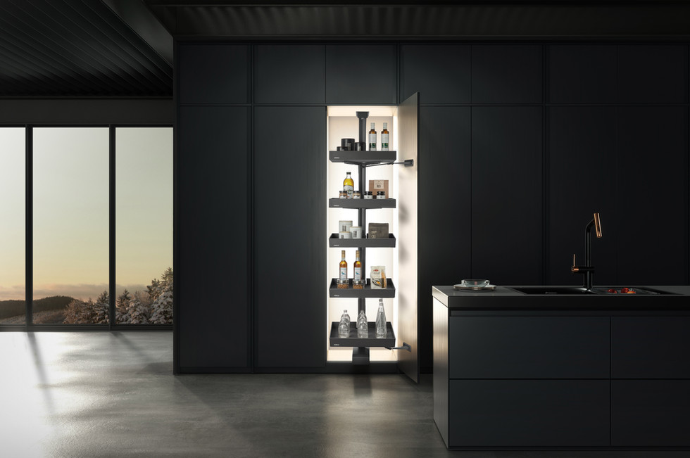 Mit dem Tower –Hochschrankauszug nutzt du den Stauraum in deiner Küche effizient und komfortabel. Er ist für 500 mm und 600 mm breite Schränke erhältlich und kann mit 5 oder 6 Tablaren individuell angepasst werden.